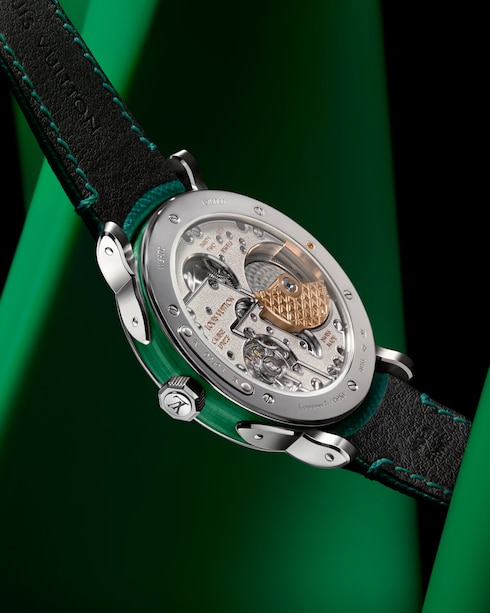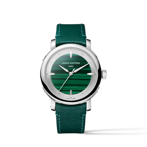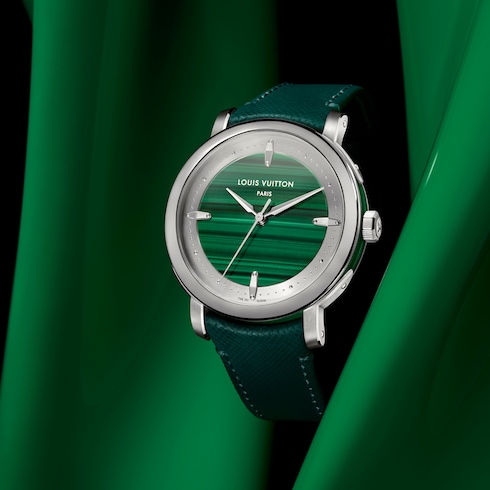 El Louis Vuitton Escale Malaquita se define por sus finas bandas minerales, que revelan tonos verdes profundos y capas variadas. Impulsado por el movimiento LFT023, cada reloj de 40 mm está engastado con piedras ornamentales acabadas con el máximo cuidado mediante una delicada técnica de pulido que revela su brillo.