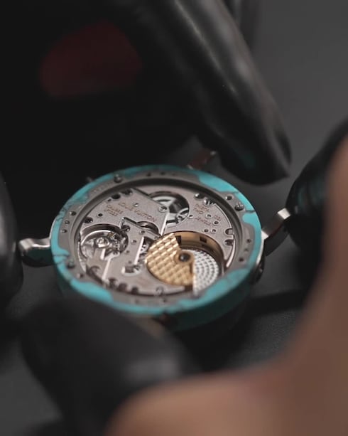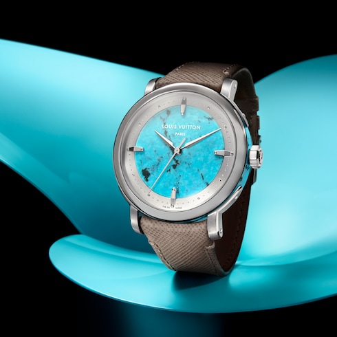 Louis Vuitton Escale Turquesa combina una esfera y una caja central en piedra azul intenso, cada una tallada a partir de un único bloque con vetas y patrones orgánicos profundos que hacen que cada pieza sea única. El reloj de 40 mm refleja la maestría técnica de La Fabrique des Boîtiers, el taller de Louis Vuitton en Ginebra dedicado al complejo arte de la fabricación de cajas avanzadas.
