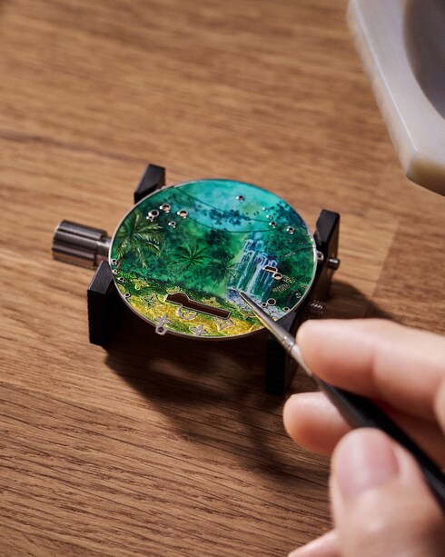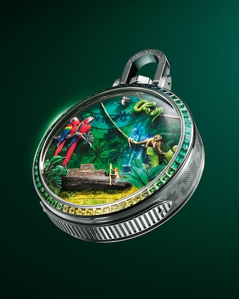 En una encarnación de audaz creatividad, Louis Vuitton se aventura en el corazón de la selva amazónica para desvelar uno de sus relojes más complicados hasta la fecha, el Escale en Amazonie. Presentando una doble perspectiva única, este sorprendente reloj de bolsillo muestra siete animaciones dentro del exuberante paisaje de la carátula, mientras que el fondo transparente de la caja revela una cautivadora visión mecánica: el calibre LFT AU14.03 autómata y repetidor de minutos, con exquisitos acabados artesanales.