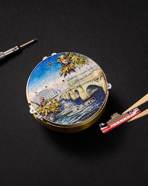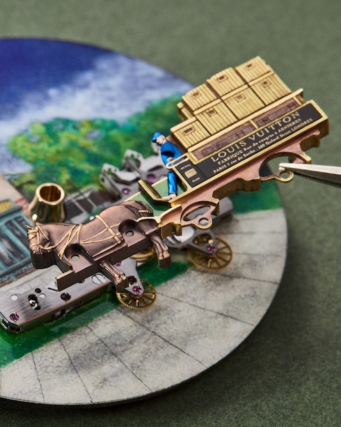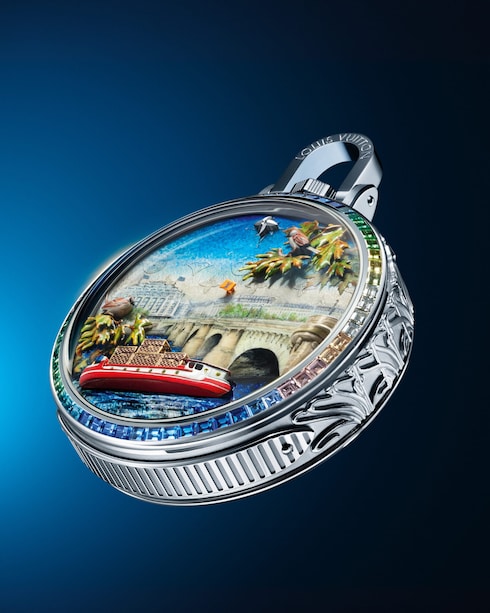 El reloj de bolsillo Escale au Pont-Neuf, una oda al legado de la Casa en la fabricación de baúles y a su espíritu innovador, celebra la historia de Louis Vuitton, situada a orillas del río Sena, con vistas al puente más antiguo de París. El pintoresco paisaje de la carátula se anima a través de siete animaciones, impulsadas por el movimiento mecánico más complejo de la Manufactura hasta la fecha, el calibre LFT AU14.03 de cuerda manual, que muestra su meticulosa artesanía a través del fondo de la caja.