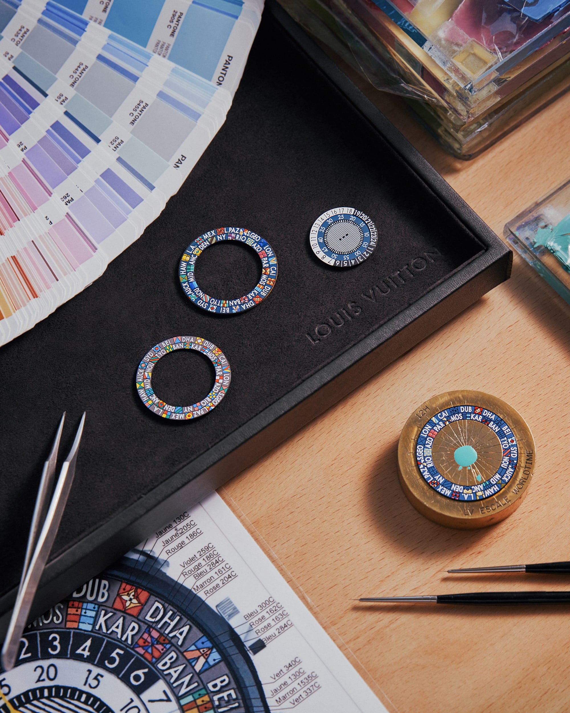 En un arquetipo del encuentro entre los esmaltes y el calor del horno que revela el brillo y la intensidad de los colores, el esmaltado es un arte exigente que requiere habilidades sumamente técnicas, adquiridas a lo largo de muchos años por los maestros esmaltadores de La Fabrique du Temps Louis Vuitton. Algunas de estas habilidades son el plique-à-jour, con su juego de transparencia y contrastes, realzado por una estructura dorada tipo cloisonné o alveolada, y el paillonné, que magnifica las capas de esmalte con finas partículas de pan de oro.