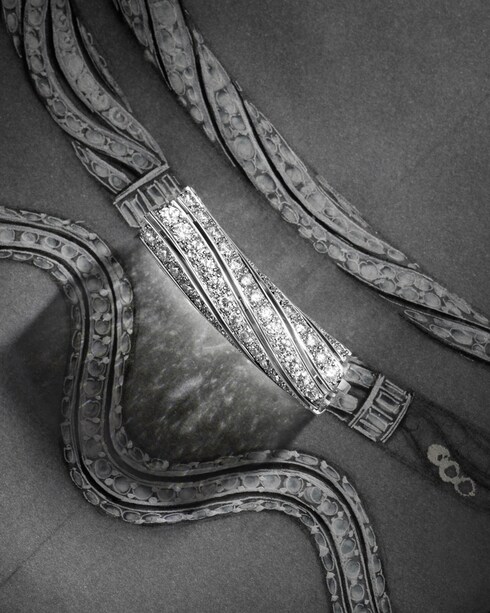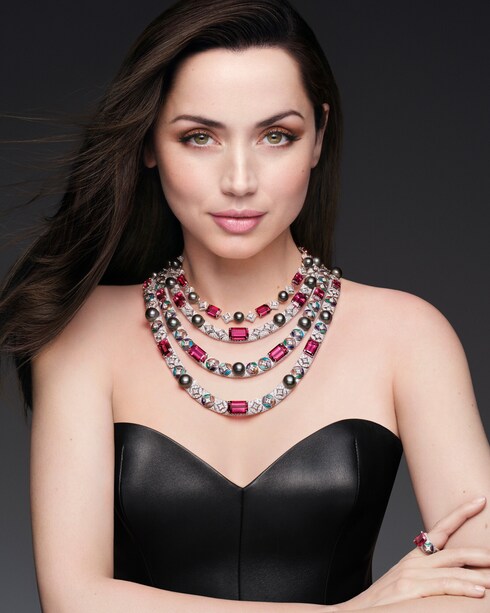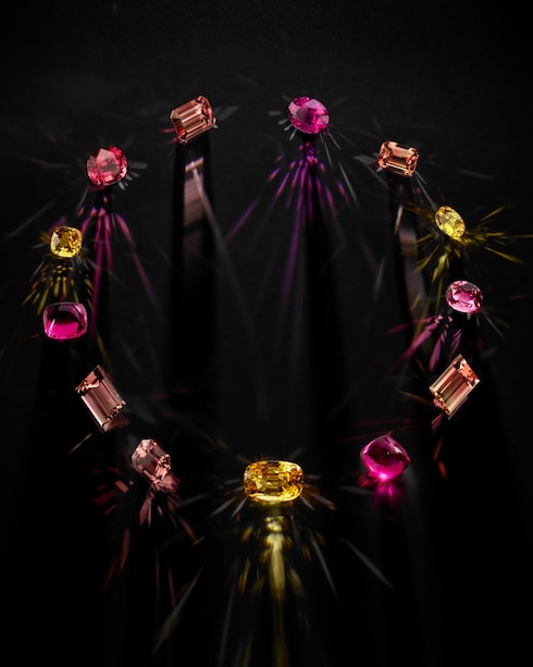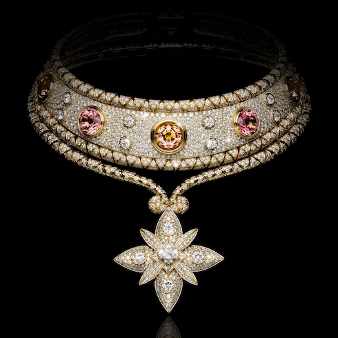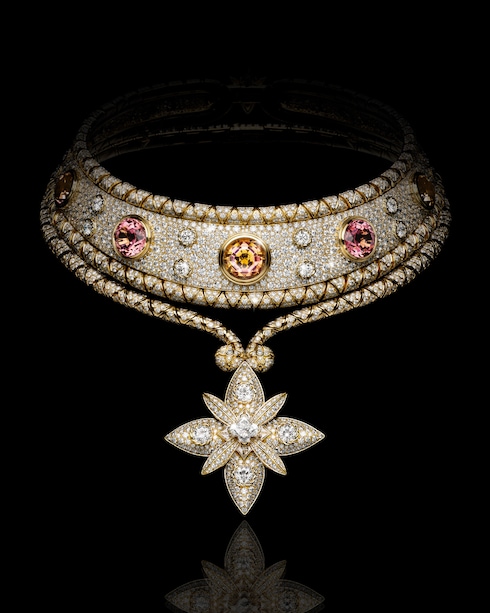 Un resplandeciente tributo a la gracia femenina, Aura celebra la Flor del Monograma - un emblema perdurable de la Casa - a través de suaves tonos rubor y luminosos contrastes. Las turmalinas bicolores reflejan tanto poder como delicadeza, formando un radiante halo de luz creativa, que dirige el viaje del artista por un sendero iluminado de visión e iluminación.