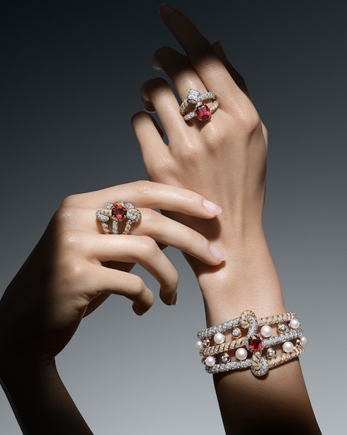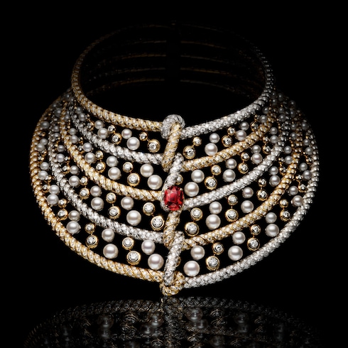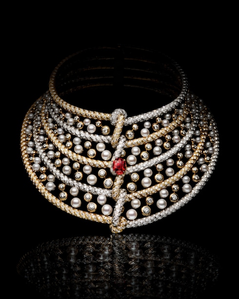 Connection encarna una puerta a la creatividad infinita, donde el savoir-faire se convierte en un pasaje hacia la imaginación sin límites y la innovación audaz. Transformando la maestría en posibilidades ilimitadas, un collar compuesto por cinco hilos de diamantes y perlas encarna la armonía del virtuosismo técnico y el brillo creativo, realzado por un extraordinario rubí Pigeon Blood de 6,04 quilates.