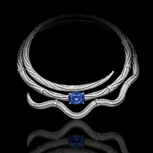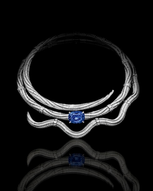 Motion captura la creatividad en perpetuo flujo, llevándose todo a su paso. Un majestuoso zafiro de 35,69 quilates ancla una grácil corriente de diamantes, encarnando el pulso de la invención. En esta poderosa expresión, el movimiento se convierte en significado, un audaz paso al ritmo de la creación.