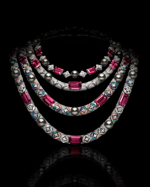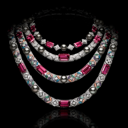 Floración de la creatividad, Florescence encarna la metamorfosis de la inspiración en posibilidades inesperadas. Reinterpretando con vibrante audacia los motivos Monogram Flower y Kite, evoca los códigos icónicos de la Casa. Las turmalinas indicolita y rubelita florecen en armonioso contraste, revelando un poderoso y refinado juego de colores y formas: 12 indicolitas que suman 174,63 quilates y 20 rubelitas para 164,18 quilates. Anclada por un diseño versátil con filas desmontables, la pieza evoca el movimiento y la transformación.