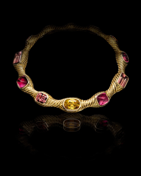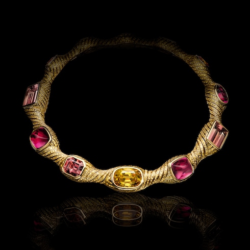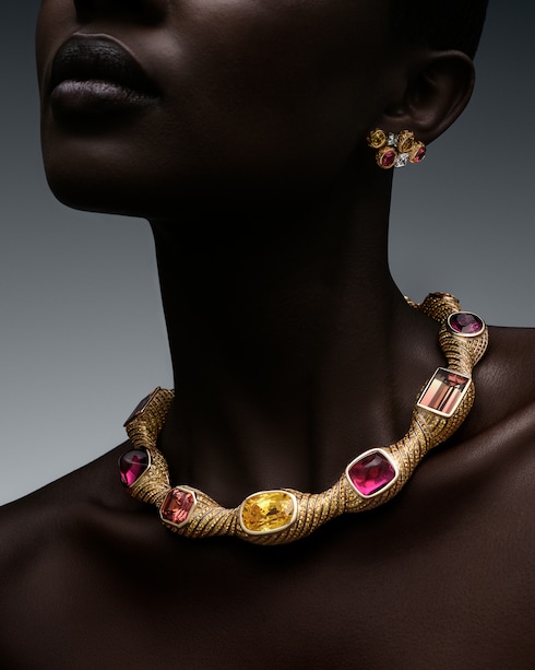 Un jubiloso estallido de colores vibrantes, Joy irradia abundancia y exuberancia. La creatividad se transforma en una poderosa ola cromática, cuerdas en espiral de oro amarillo se enroscan alrededor de vívidos zafiros de más de 40 quilates y turmalinas de más de 20 quilates, en diversas formas y cortes, que representan un total de 204,63 quilates --- una silueta dinámica que celebra la libertad y la alegría de la creación audaz.