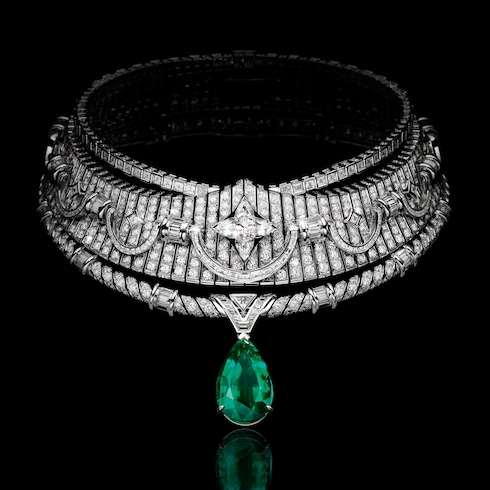 En Maestria, el conocimiento se despliega y revela sus secretos a través de la búsqueda de la exactitud y el control, trazando el camino hacia la precisión y la excelencia. La habilidad y el savoir-faire adoptan una forma arquitectónica con un sorprendente tríptico de esmeraldas colombianas, centrado en torno a una rara piedra viva de 8,88 quilates y una meticulosa disposición geométrica de diamantes, engastados en precisos patrones Louis Vuitton.