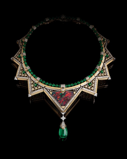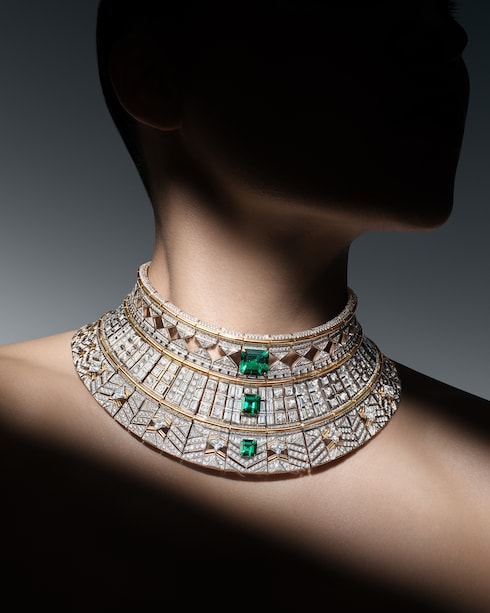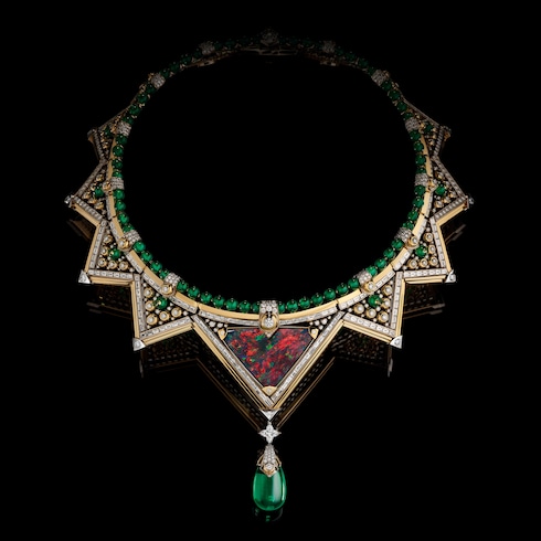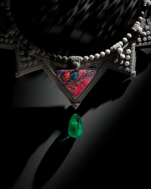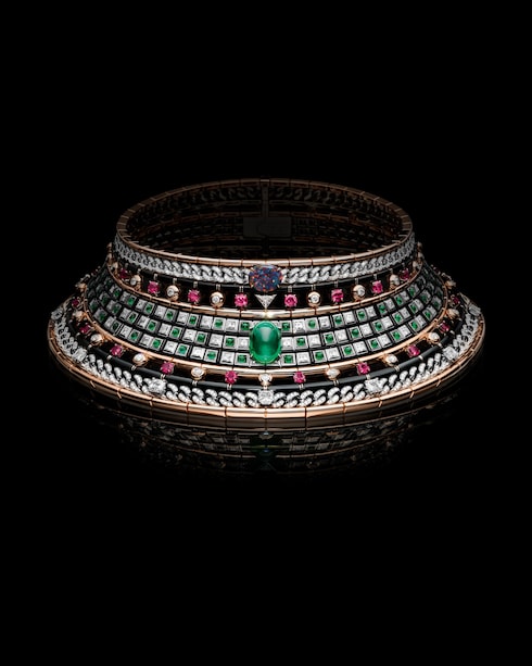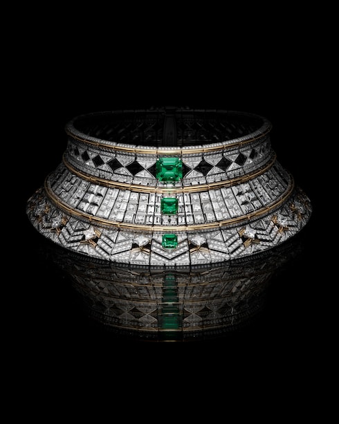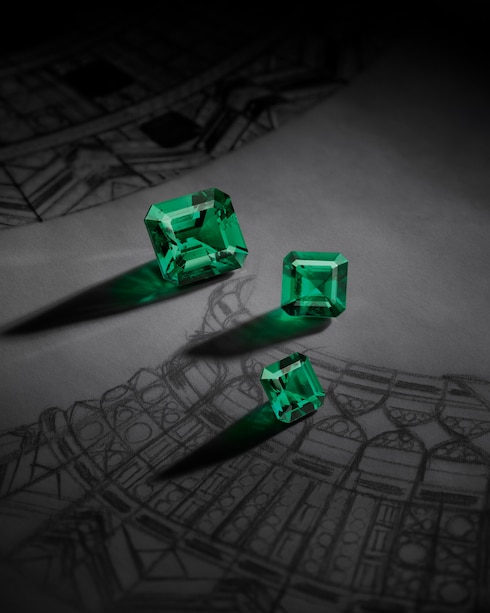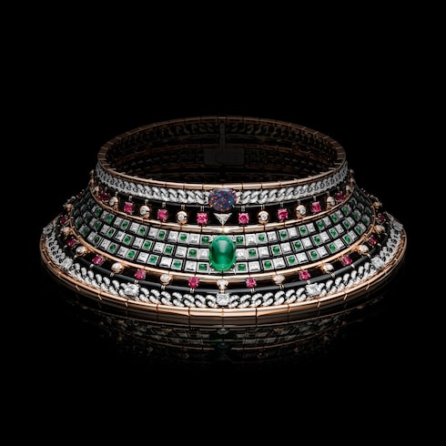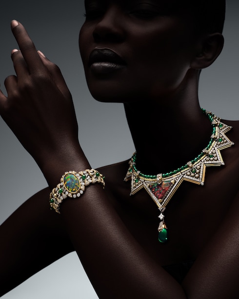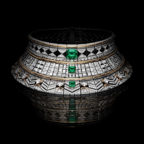 Capturando el estimulante ascenso de aprendiz a maestro, Monumental simboliza la excelencia y la precisión dedicadas, transmitidas a través de un deslumbrante conjunto de coloridas joyas. Una esmeralda de Zambia de 12,84 quilates se coloca sobre un elaborado motivo Damier compuesto por 320 esmeraldas, diamantes, rubíes y ónices para reflejar intrincadamente la paciente progresión de las hazañas arquitectónicas, ensambladas piedra a piedra.