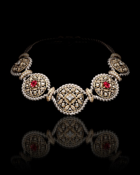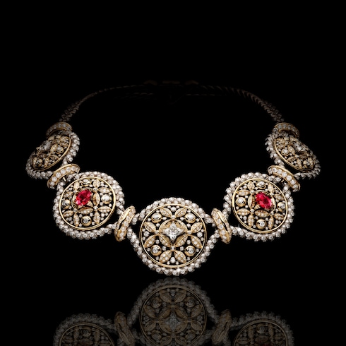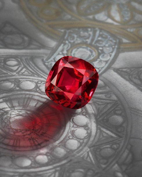 Protection evoca la preciada conservación del conocimiento a través de motivos en forma de escudo, fuertes y delicados a la vez, realzados por radiantes rubíes, diamantes y perlas. Su forma pura y circular simboliza la conservación atemporal, mezclando elegancia y poder simbólico en una pieza de joyería de belleza perdurable: una sabiduría preciosa cuidadosamente protegida.