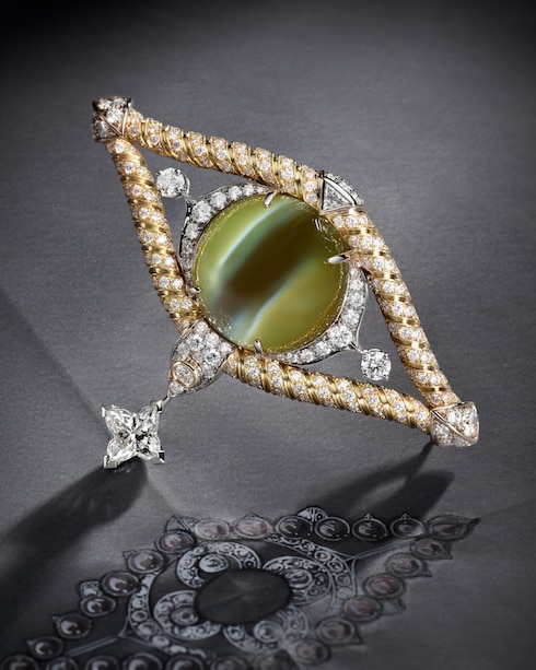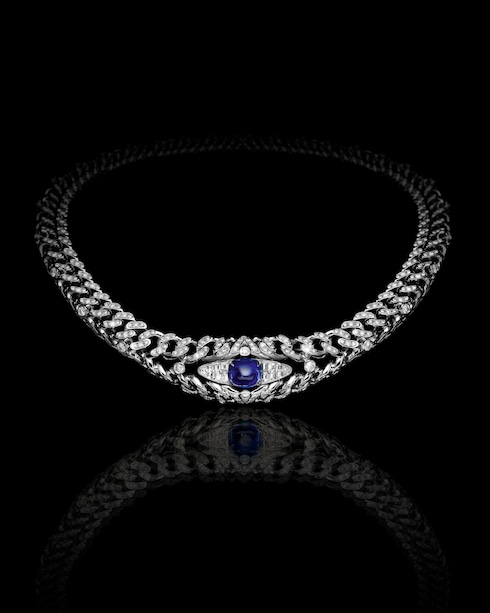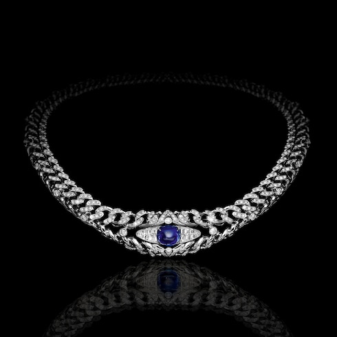 Guardián y guía con una mirada que todo lo ve, Keeper encarna el ojo vigilante que preserva el conocimiento eterno. En su corazón, el delicado y enigmático conjunto incluye un collar unisex de zafiro azul de Sri Lanka de 10,12 quilates, con emblemáticos triángulos en forma de V engastados con diamantes y detalles inspirados en un baúl.