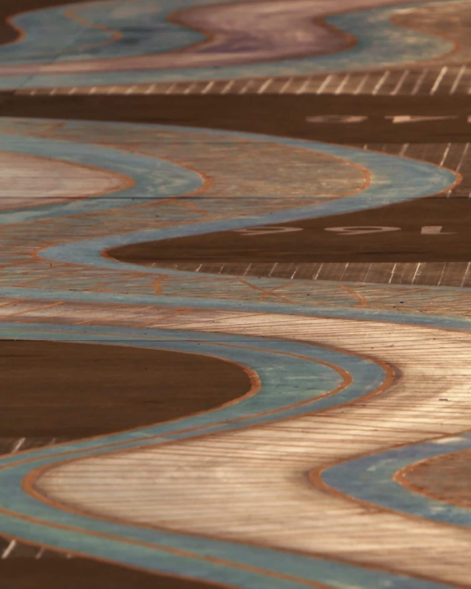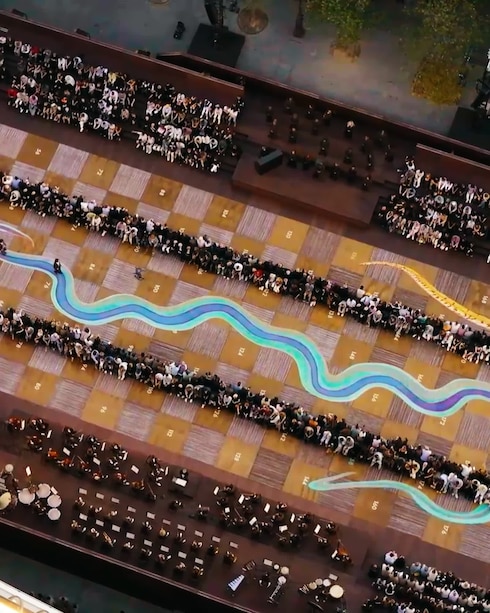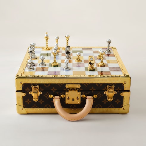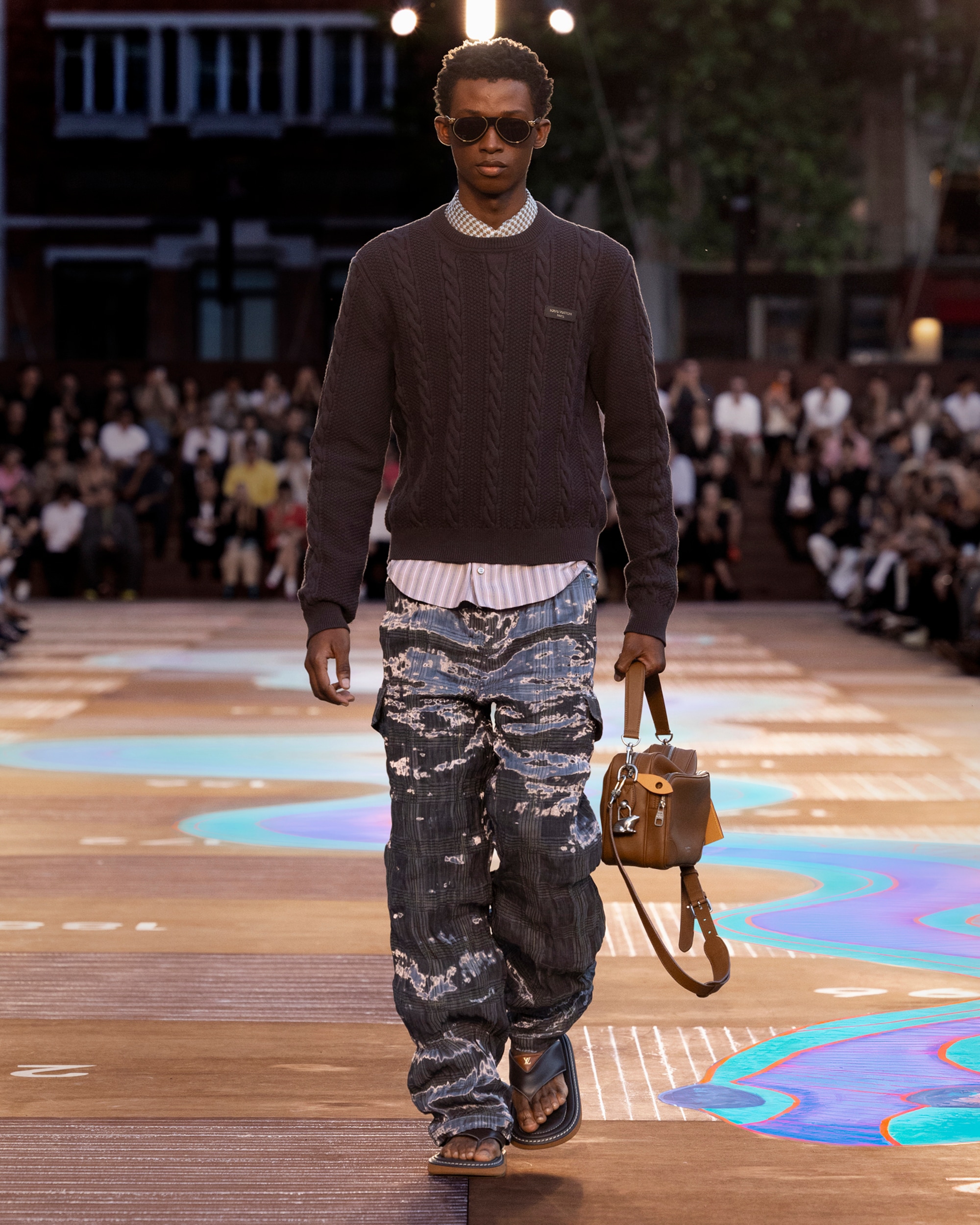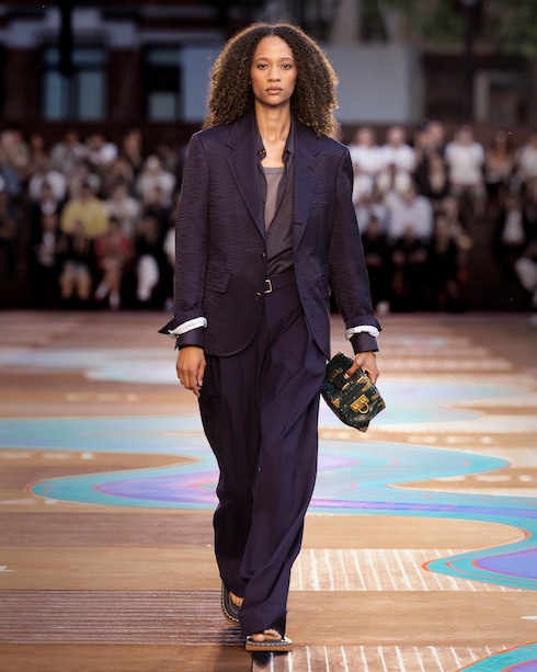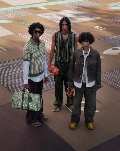 En una colaboración escenográfica con Studio Mumbai, el tradicional juego de Serpientes y Escaleras se amplía hasta convertirse en una construcción a tamaño real, replanteando el icónico motivo Damier a través de una fusión cultural, transformando al público y al reparto en jugadores en un metafórico escenario de posibilidades.