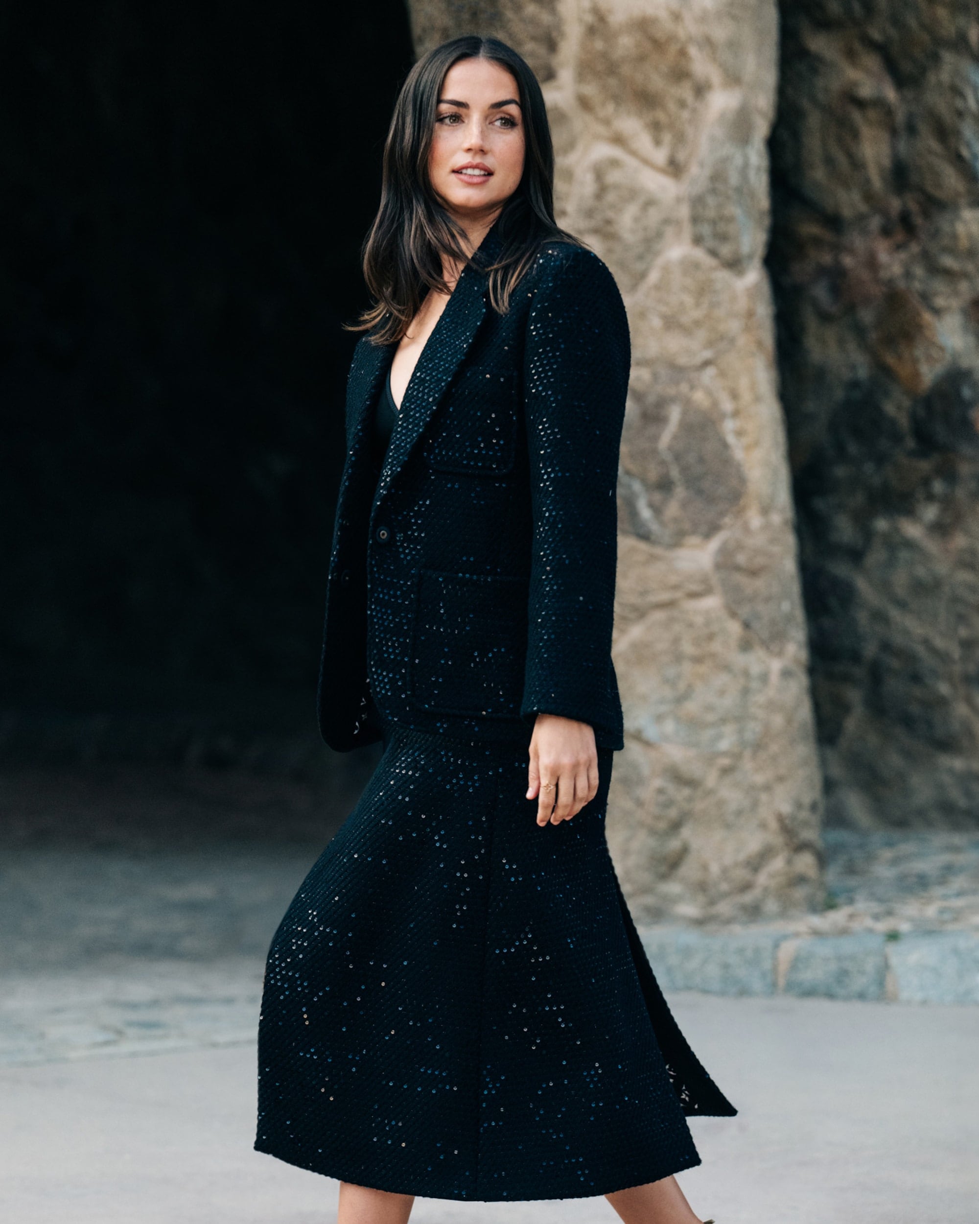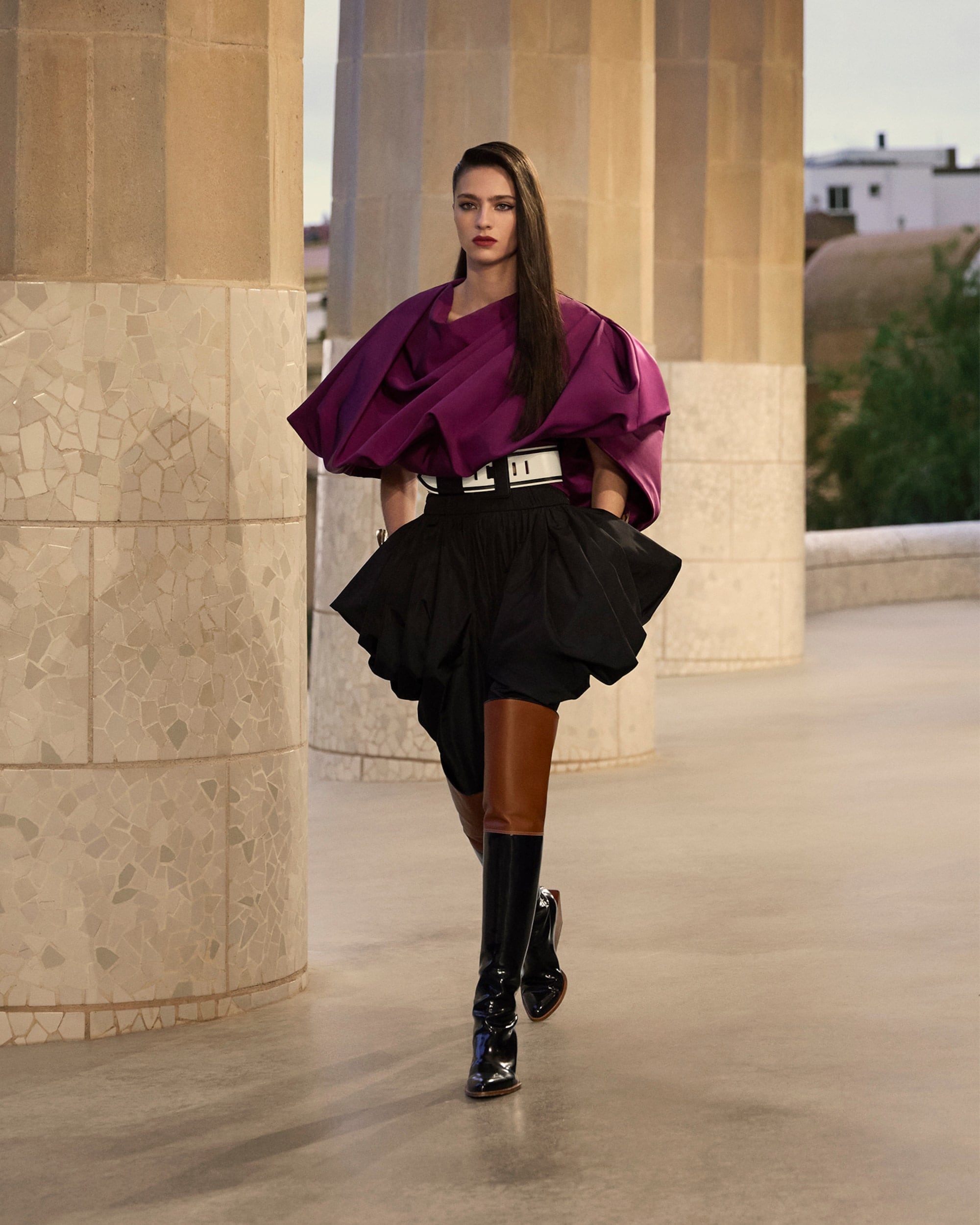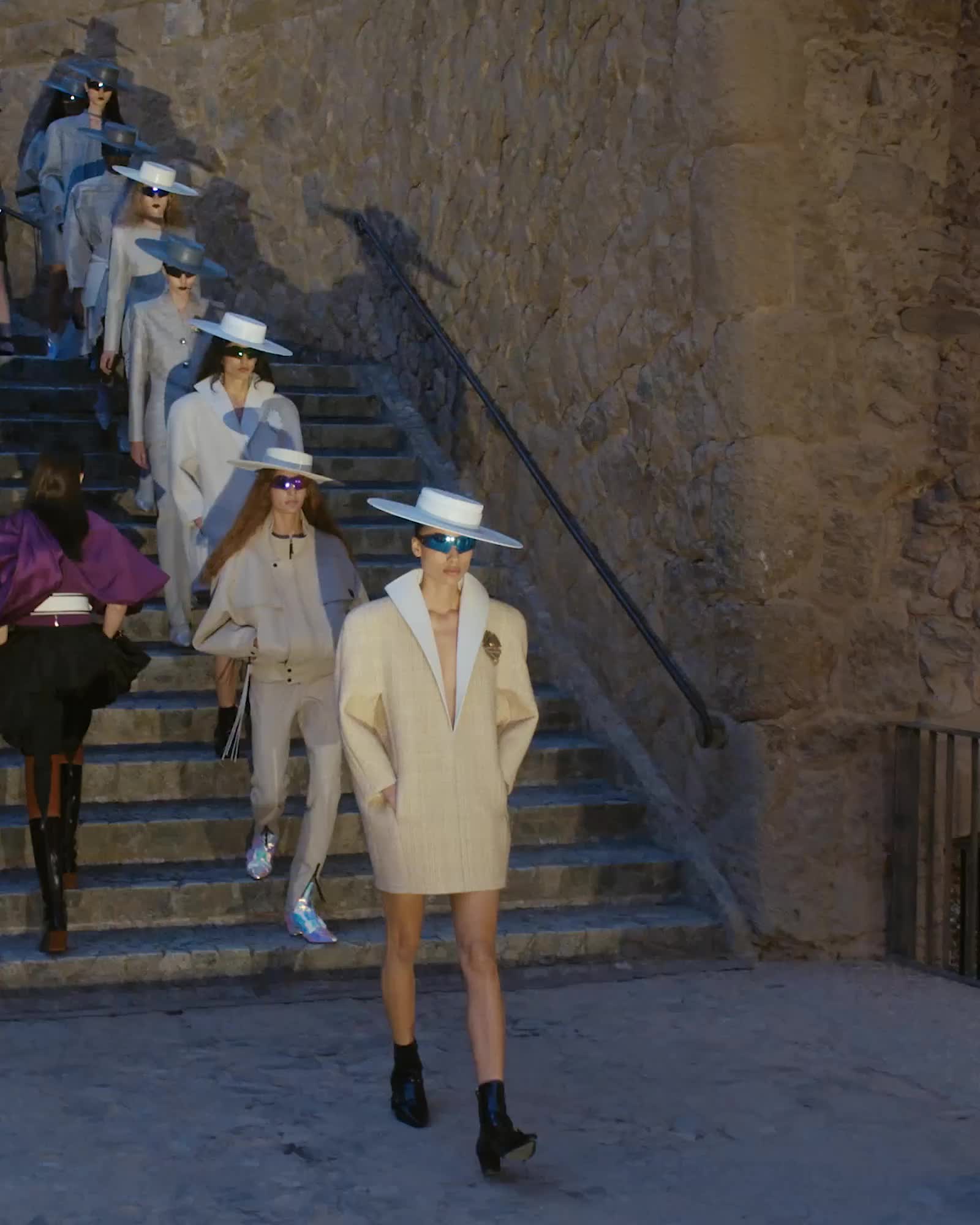 Desde la sastrería nítida hasta las siluetas extravagantes animadas con claroscuros gráficos, Nicolas Ghesquière impregna su estilo característico con un apasionado estilo español, cultivando un encanto polifacético a través de un viaje emocional de descubrimiento.