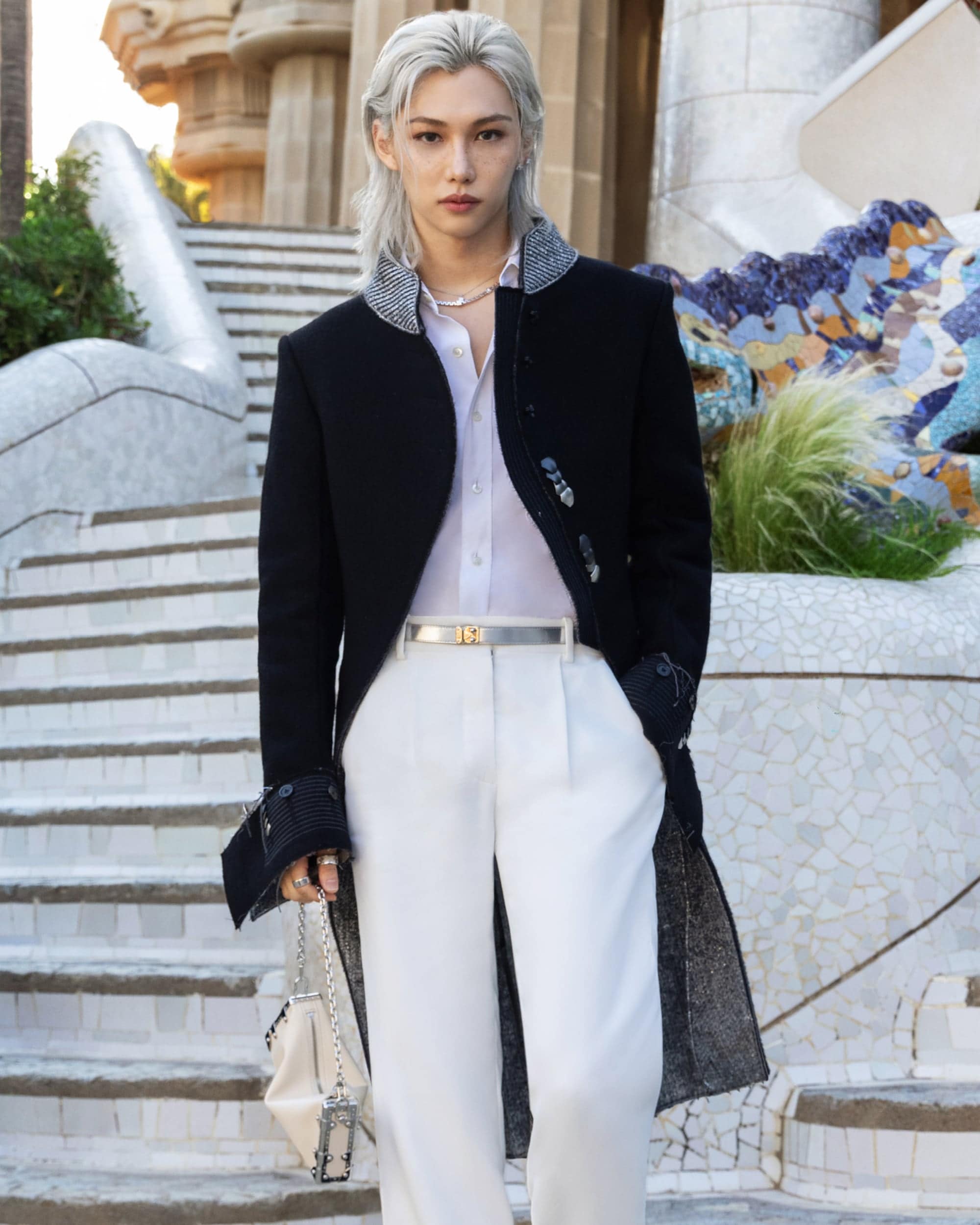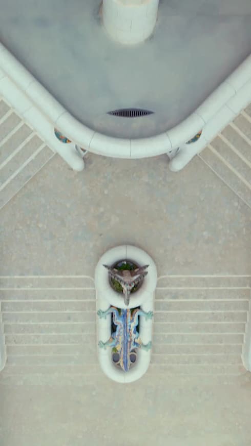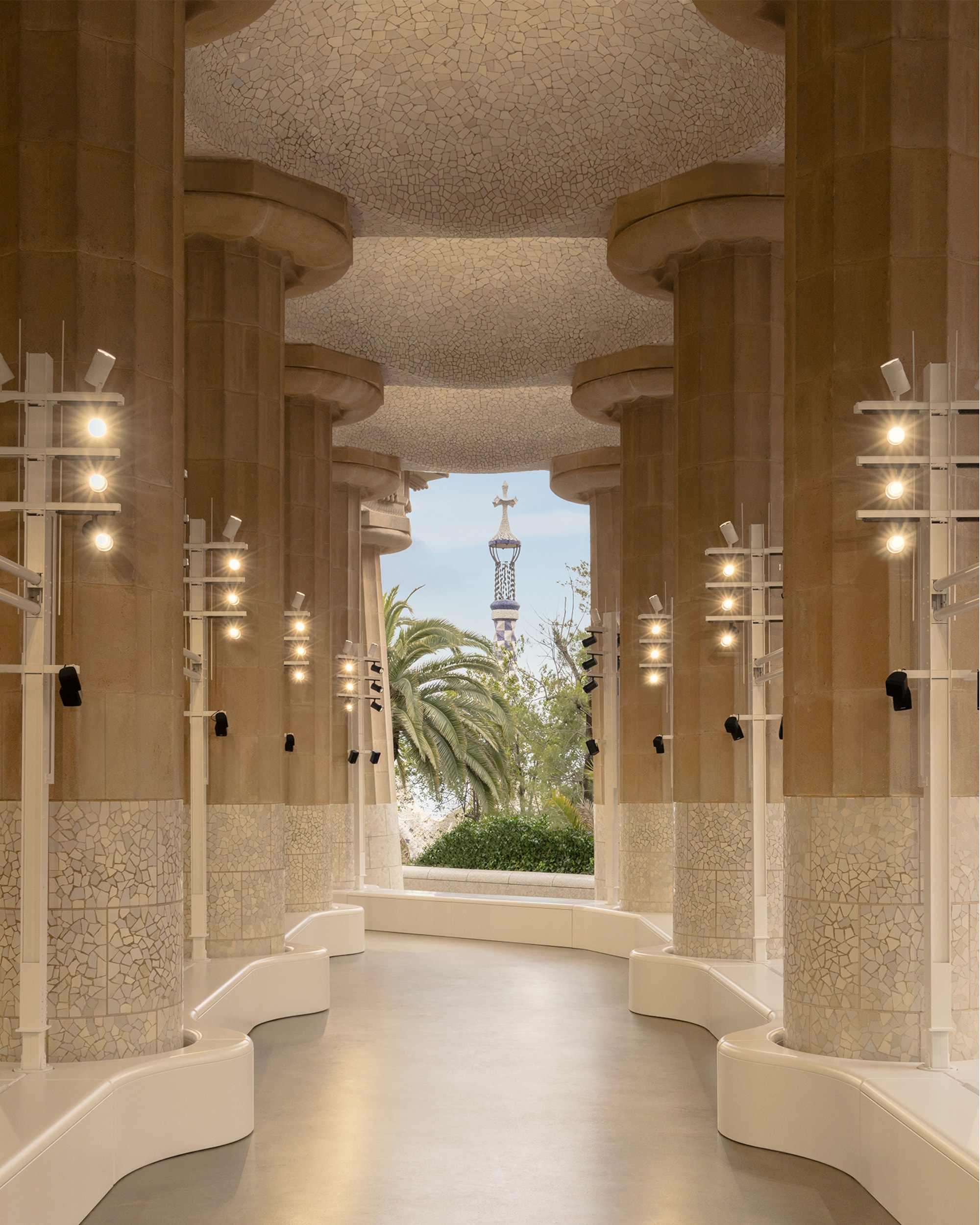Imaginado por el arquitecto Antoni Gaudí, la estética vanguardista que fusiona naturaleza, piedra y mosaicos se hace eco del espíritu visionario de Louis Vuitton, creando un cautivador telón de fondo realzado por la armoniosa escenografía curva de James Chinlund.