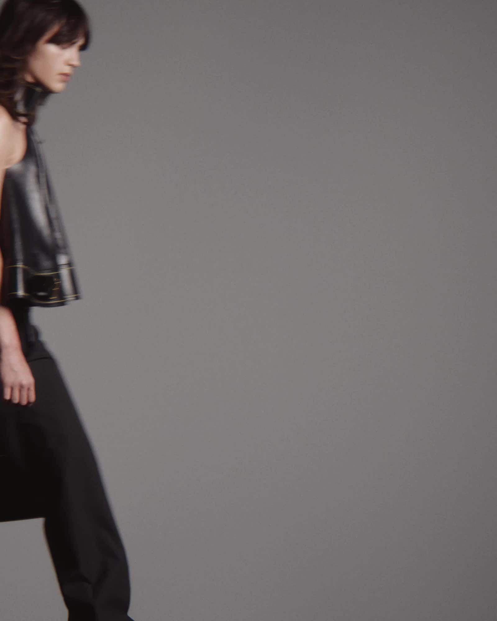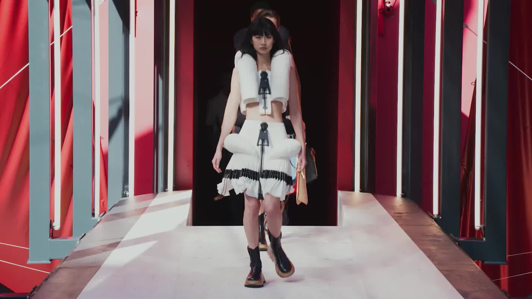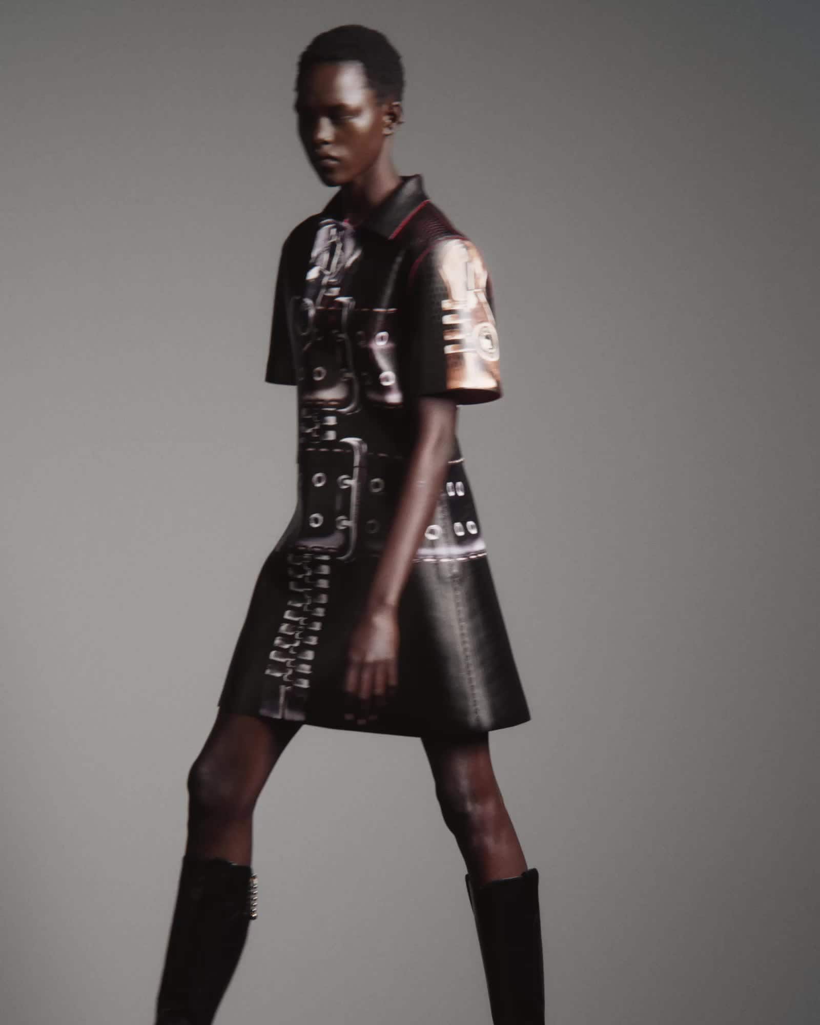 Al acercarse a los elementos del vestuario femenino, se reinventan las proporciones y las escalas, creando siluetas en las que reinan los detalles. Los cinturones impresos con efecto 3D adquieren un efecto de trompo, mientras que los pliegues de una falda escocesa se amplían y se convierten en vestidos plisados planos, añadiendo un aspecto lúdico y único. Nicolas Ghesquière también utiliza un bordado que simula un macro tweed, creado mediante un escáner 3D y ampliando cada imagen para resaltar cada hilo y su textura. Utilizando el énfasis como figura de estilo, una selección de bolsas adquiere detalles desproporcionados, mientras que otras se recrean con proporciones dramáticas.