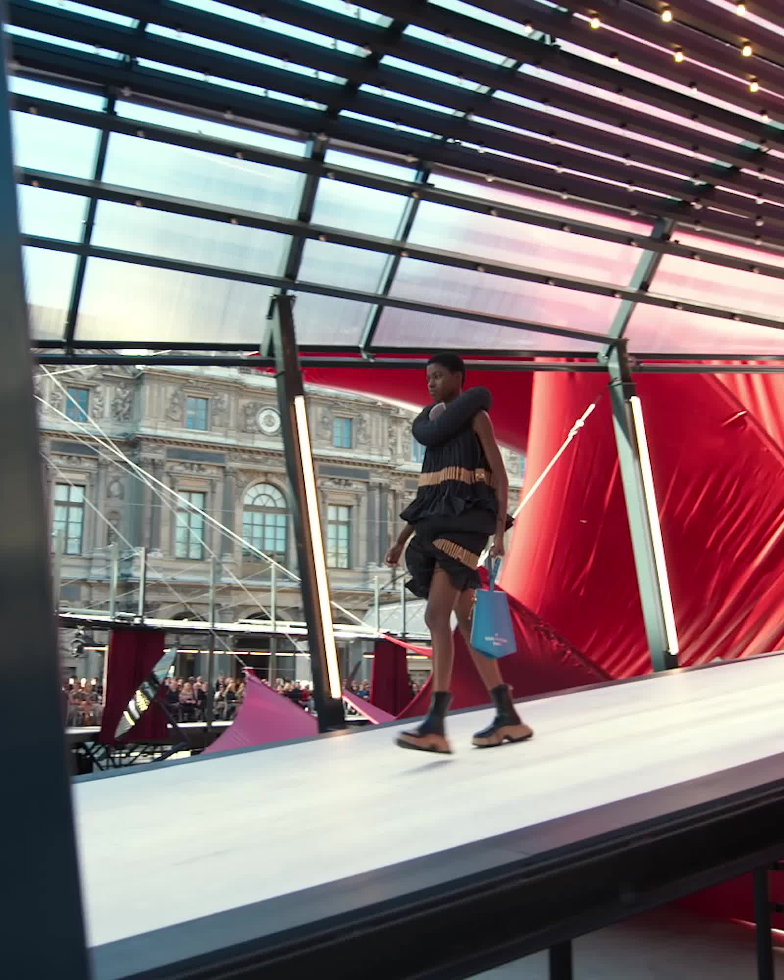 En el majestuoso entorno del Louvre de París, la Colección Primavera-Verano 2023 de Louis Vuitton se presenta en la Cour Carrée del museo. Por primera vez, Nicolas Ghesquière ha invitado al destacado artista contemporáneo francés Philippe Parreno y al diseñador de producción James Chinlund a conceptualizar la espectacular escenografía del evento. Con rejillas metálicas, espejos y una miríada de bombillas que evocan una atracción de feria, el decorado se centra en una "flor monstruosa" de color rojo vivo con estambres dorados que se elevan dramáticamente hacia el cielo parisino.