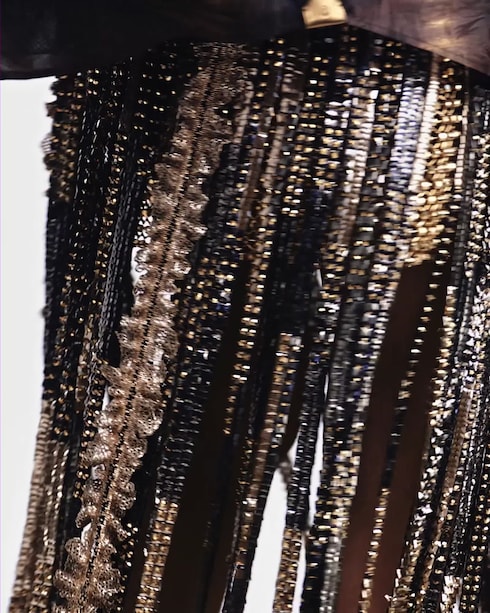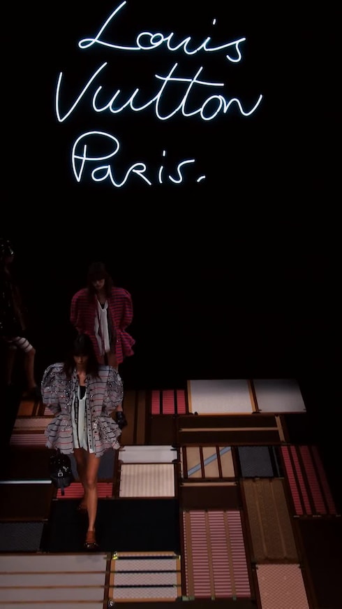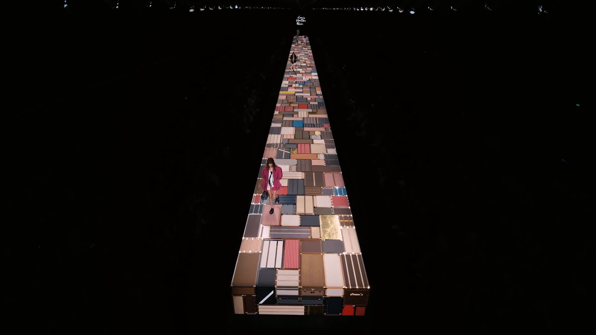 Una plataforma rígida compuesta por más de mil baúles diferentes, la pasarela central del desfile de Nicolas Ghesquière rinde homenaje a la historia de la Maison, situándose en primera línea de una inmersiva estructura de espejos, reflejo de la majestuosa arquitectura de la Cour Carrée du Louvre de París.