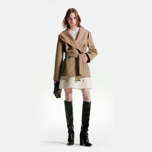 El emblemático abrigo envolvente con doble botonadura de la Maison se reinterpreta para la temporada en felpa de lana y seda de doble cara. El modelo luce un forro con el fascinante motivo Jacquard Monograma con efecto tridimensional que aporta el toque de la Maison con un estilo contemporáneo. La cálida pieza se completa con una amplia capucha, elegantes ribetes en piel y un cinturón con Canvas Monograma en las puntas que crea una silueta femenina.