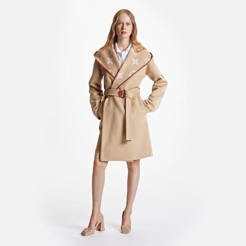 Este abrigo envolvente con capucha, un modelo emblemático de Louis Vuitton, está elaborado en una combinación de lana y seda con una técnica de doble cara. La prenda luce un motivo Monograma oversize en el interior y un cinturón característico de la temporada que acentúa la elegante y femenina silueta. La pieza presenta un parche en piel en la manga que aporta el toque final de la Maison.