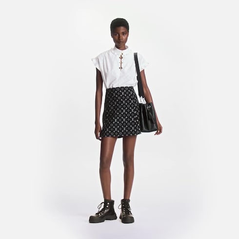 Esta blusa está confeccionada en suave popelín de algodón y adornada con fil coupé Monograma. Los botones LV en el cuello y la flor Monograma de color dorado en la parte delantera realzan la pieza. Este emblemático diseño de Louis Vuitton, con femeninos volantes en el cuello y las mangas, es una prenda que no puede faltar en el armario.