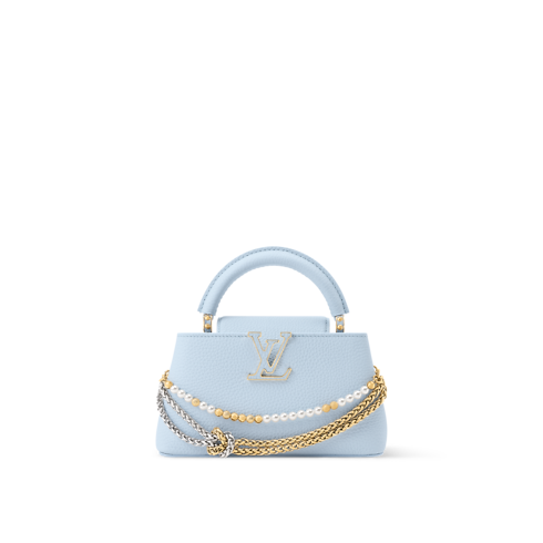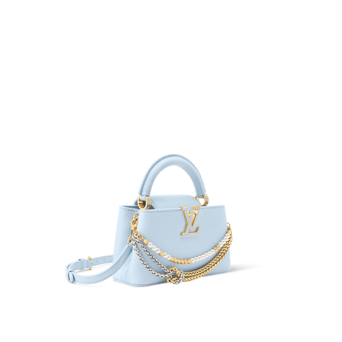 La bolsa Capucines EW Mini se reinventa para la colección Why Knot en un elegante color azul Olympe. Este diseño alargado, confeccionado en piel Taurillon, se realza con piezas metálicas en tonos dorado y plateado, y una cadena inspirada en la joyería de la Maison, que está adornada con un charm para bolsa Monograma y detalles de perlas. El versátil modelo se completa con múltiples bolsillos interiores y la solapa puede llevarse por dentro o por fuera.