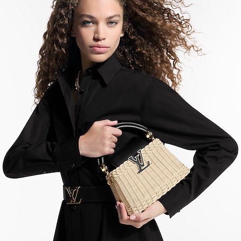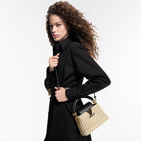 Ideal para el verano, esta bolsa Capucines Mini se inspira en el histórico modelo Picnic Trunk de 1892. Cada pieza es única, tejida a mano con ratán mediante un minucioso proceso que toma dos días. Este versátil diseño se realza con ribetes en piel y las emblemáticas iniciales LV en un elegante acabado de color dorado.