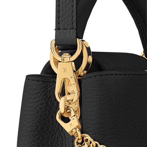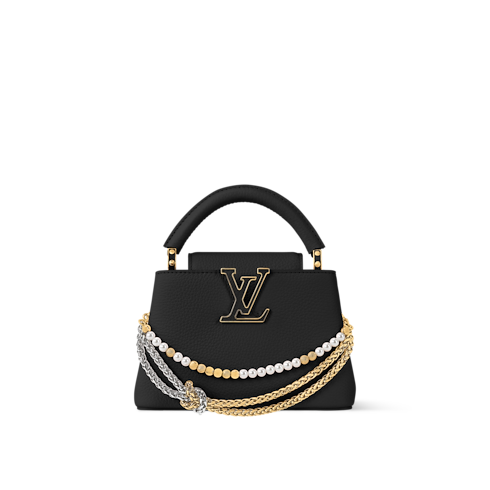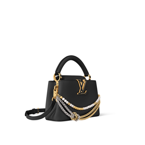 Esta elegante bolsa Capucines Mini se reinventa esta temporada para la colección Why Knot. El modelo está confeccionado en piel Taurillon de color negro y luce una cadena bigalvanizada, que está inspirada en la joyería de la Maison, y que se realza con charms para bolsa con el logotipo Monograma y detalles de perlas. Este versátil diseño se completa con una solapa que puede llevarse por dentro o por fuera y es ideal para lucir de noche.