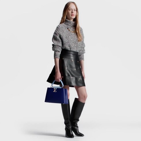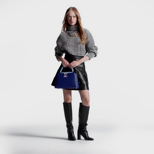 Esta bolsa Capucines MM está confeccionada en piel Taurillon de plena flor y se realza con un exquisito diseño color-block. La pieza presenta una combinación de tonos azules y blancos en la solapa y en ambos lados de la correa. Este clásico accesorio se completa con unas iniciales LV y las trabillas del asa tipo joya.