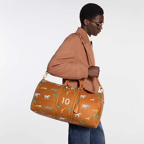 Parte de la colección LV x The Darjeeling Limited, esta bolsa de viaje Keepall 50 con correa está confeccionada en piel de becerro de curtido natural con un acabado esfumado que evoca las pieles de los archivos de la Maison. El diseño se realza con motivos de animales exóticos grabados e impresos mediante inyección de tinta para crear un efecto de relieve. La pieza se completa con unas emblemáticas iniciales LV como referencia a la obra cinematográfica.