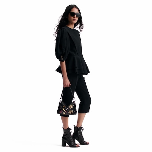 La bolsa Side Trunk MM, creada por Nicolas Ghesquière, está inspirada en los detalles característicos del desfile Primavera-Verano 2015. El modelo está confeccionado en piel de becerro y luce el motivo LV Stickers con una serie de elementos metálicos que capturan la visión del director artístico. Este diseño se puede llevar al hombro, cruzado o en la mano y se completa con herrajes de color dorado y plateado.