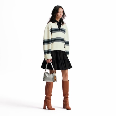 Esta moderna edición de la bolsa Side Trunk MM presenta un discreto motivo Minigrama Bold en bajorrelieve. El diseño está elaborado en piel de becerro y se realza con piezas metálicas de color dorado, como detalles de los históricos baúles de la Maison. El accesorio luce un charm de sobre en Canvas Monograma a contraste, que recrea la invitación al primer desfile de Nicolas Ghesquière y permite guardar una tarjeta.