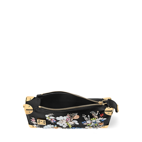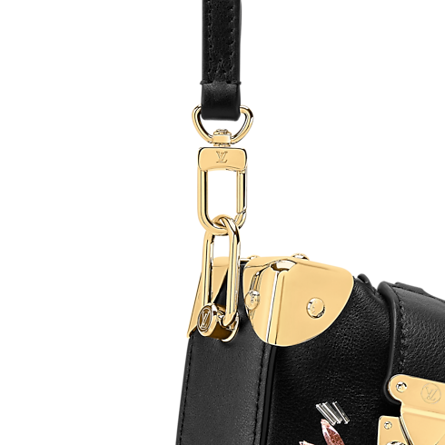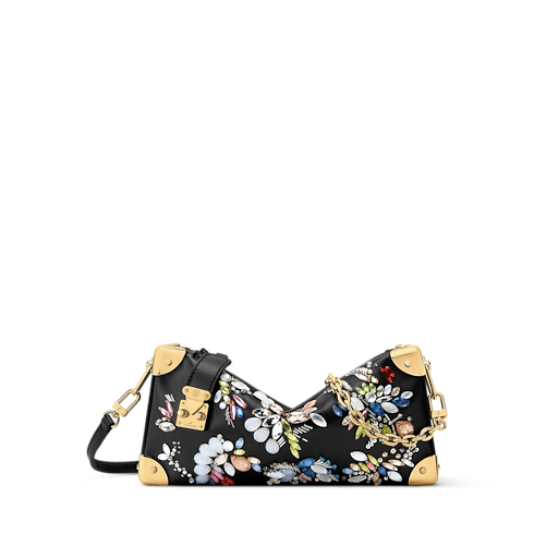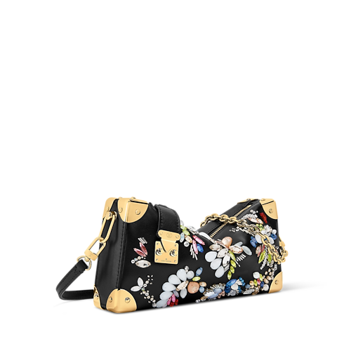 Esta llamativa edición de la bolsa Slim Trunk, parte de la colección Eden Embroideries, se adorna con gemas y cristales multicolor. La pieza está confeccionada en piel de becerro de color negro con detalles en piel y esquinas reforzadas en tono dorado. El diseño se realza con una clásica cadena y broche S-lock e incluye una correa larga desmontable que aporta versatilidad.