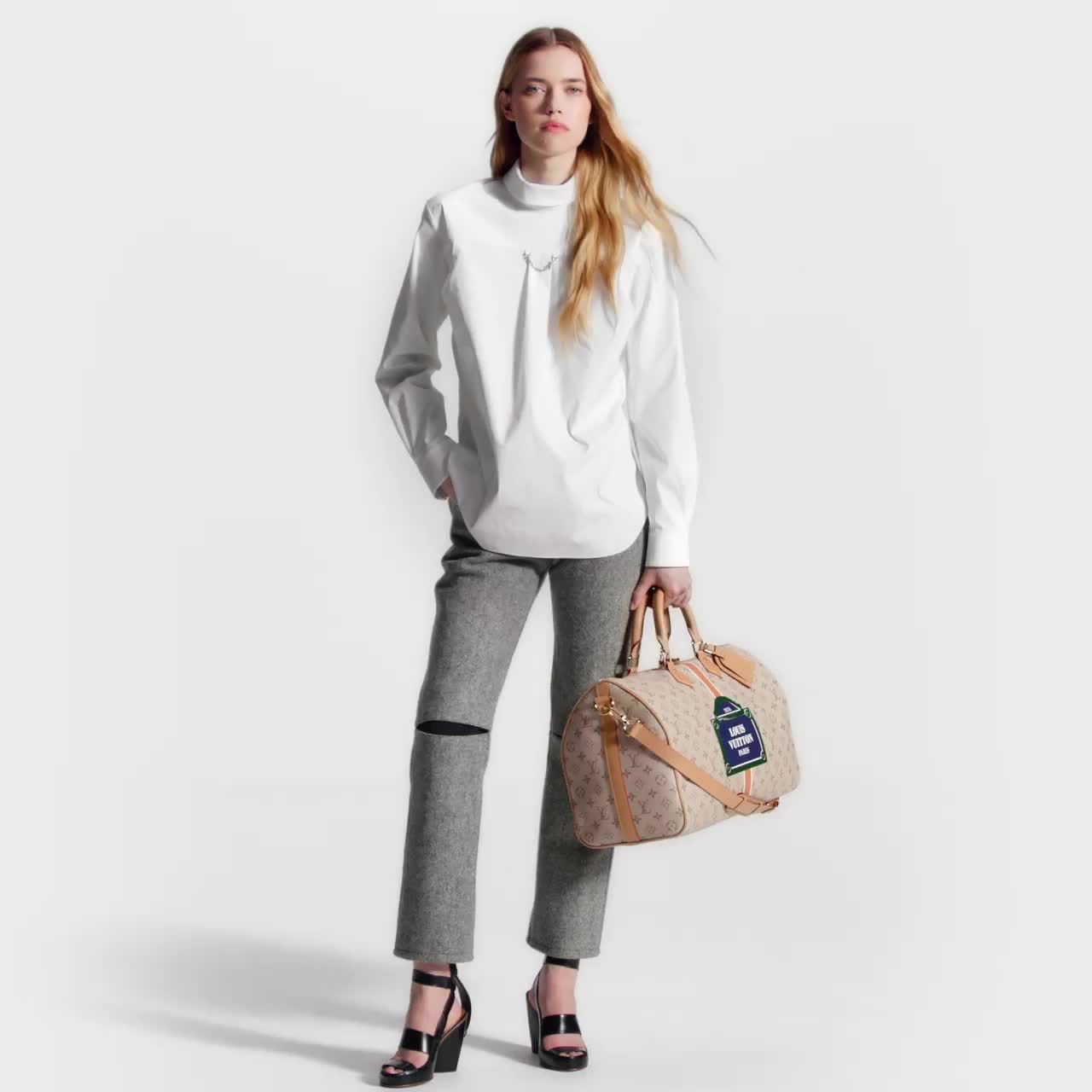 Esta camisa presenta una reinterpretación de una prenda clásica con un toque contemporáneo. La pieza está confeccionada en suave y transpirable popelina de algodón y destaca por su original construcción invertida. El modelo luce un cuello perkins, un pliegue y una cadena LV en la parte frontal y se completa con una elegante abertura en la espalda.