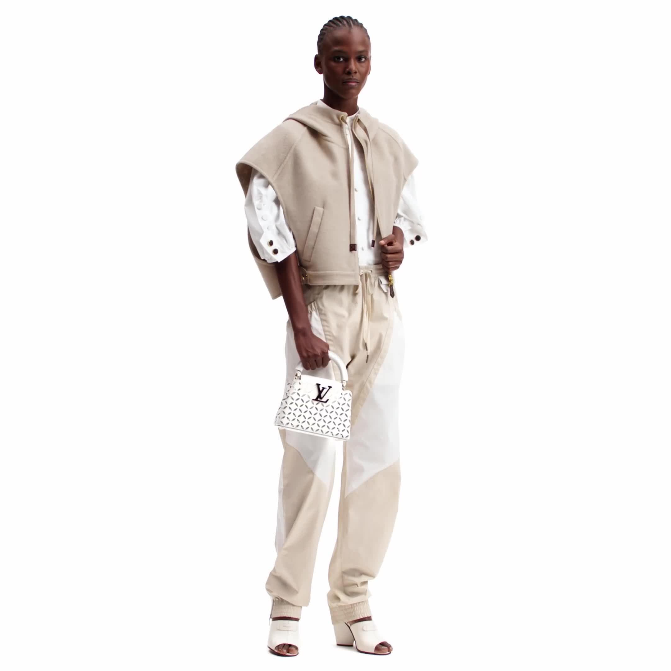 Este moderno chaleco con capucha, un imprescindible modelo de la Maison, está confeccionado en una mezcla de lana, cachemir y seda de doble vista. La pieza luce un versátil tono de temporada, así como el emblemático motivo Monograma en la parte interior. Este diseño desestructurado presenta un cierre frontal doble de color dorado y botones de corchete en los costados.