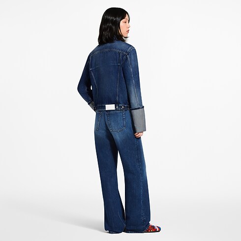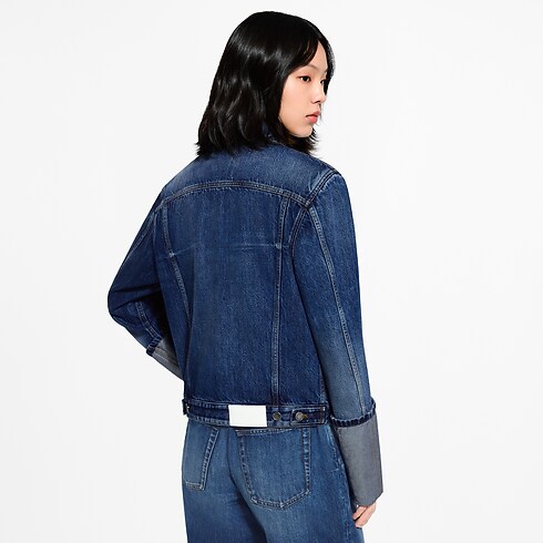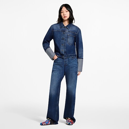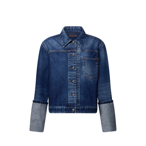 Esta chamarra de mezclilla tiene proporciones llamativas que le dan un estilo moderno. Está confeccionada en denim azul clásico, con costuras amarillas a contraste que resaltan la construcción y un bolsillo de parche en el pecho. Las mangas terminan con puños grandes doblados y la cintura lleva la etiqueta de piel Louis Vuitton de esta temporada.