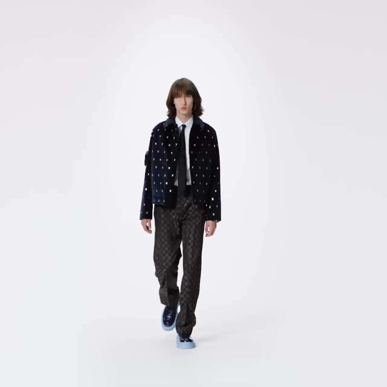 Esta chamarra está confeccionada en terciopelo en un tono azul oscuro. El elegante modelo de inspiración utilitaria se adorna con pequeños logotipos LV de color plateado. La pieza se completa con un moderno bolsillo redondo en la manga derecha.