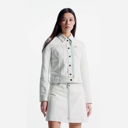 Esta reinterpretación de la clásica chamarra denim luce un sutil efecto blanqueado. La prenda de corte ajustado presenta un cierre de color azul claro, piezas metálicas doradas, dos bolsillos en el pecho y las características costuras en V de la Maison. Este modelo de estilo vintage e informal se completa con modernos detalles distintivos en piel VVN.