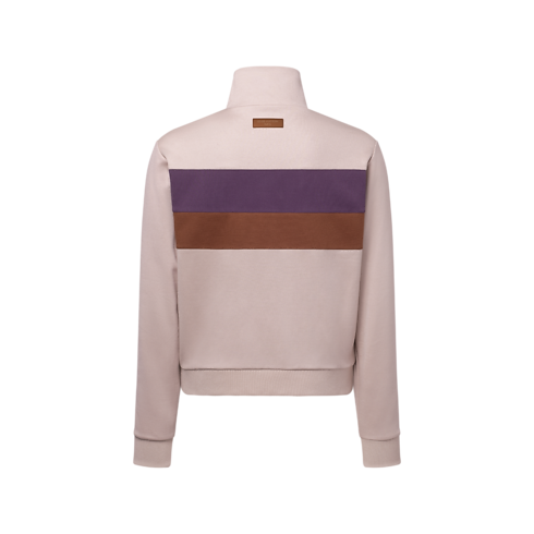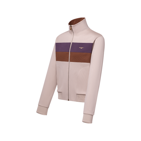 Esta elegante chamarra deportiva en color beige reinterpreta una silueta casual. El modelo, confeccionado en punto de algodón de doble cara, se realza con bandas a contraste y un sutil distintivo Louis Vuitton Paris dorado en el pecho. La prenda se completa con un interior con el motivo gráfico LV x The Darjeeling Limited de la temporada, y un parche en piel en la parte posterior.