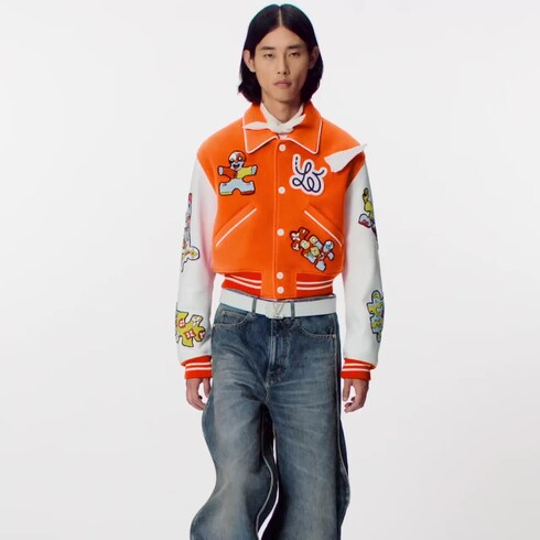 Este chamarra universitaria está confeccionada en lana color naranja brillante con llamativas mangas de piel en tono blanco. Esta pieza presenta exqusitos detalles, una silueta cropped informal y se realza con divertidos motivos bordados. El modelo se completa con un logotipo LV en el lado izquierdo del pecho y un parche de arcoíris con el distintivo Louis Vuitton elaborado en crochet en la parte posterior.