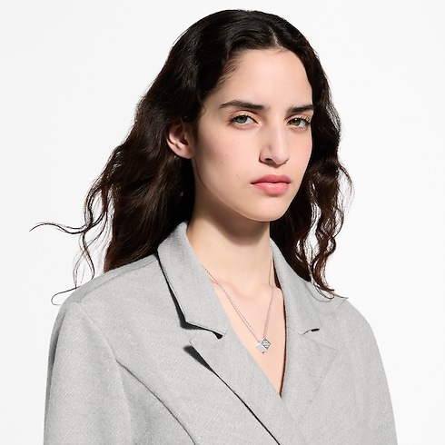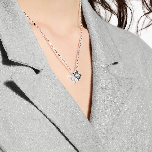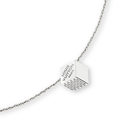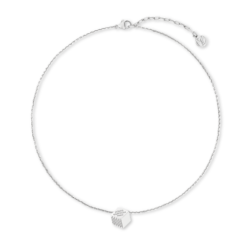 El collar LV Cube se inspira en un ícono de la historia de la Maison: Pateki, un juego creado por Gaston Vuitton en 1932. El modelo presenta un cubo de metal grabado con líneas que evocan el emblemático patrón Damier. Esta pieza, ideal para usar en el día a día o en ocasiones especiales, se completa con el distintivo Louis Vuitton Paris.