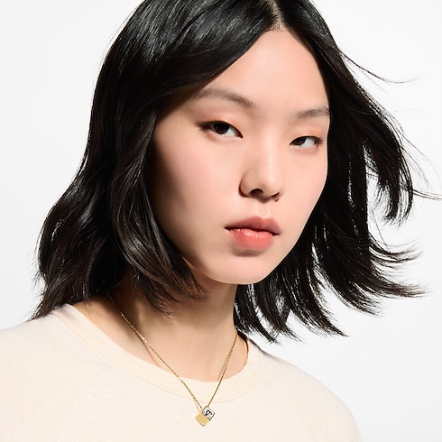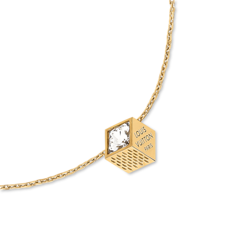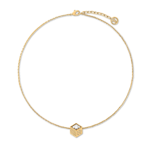 El collar LV Cube se inspira en el espíritu lúdico de Pateki, un juego de rompecabezas creado por Gaston Vuitton en 1932. El modelo presenta un cubo de metal dorado con un cristal y con un grabado que evoca el legado del Canvas Damier. Este diseño único se completa con un distintivo Louis Vuitton Paris que aporta el toque final de la Maison a esta divertida y llamativa pieza.