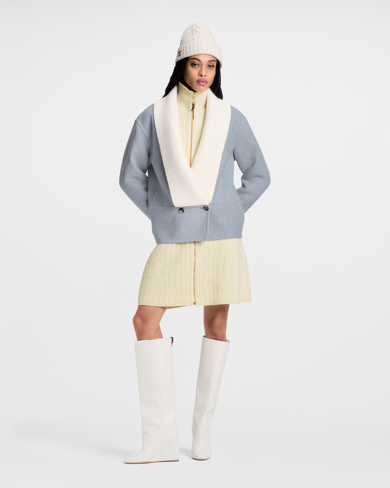 Esta cómoda y moderna chamarra está confeccionada en mezcla de lana y seda de doble cara con un efecto óptico en denim. La pieza oversize luce un cuello chal y puños en punto elástico a contraste. El modelo se realza con dos botones en la parte frontal, un motivo Monograma en el interior y un parche de montaña Louis Vuitton en la parte posterior.