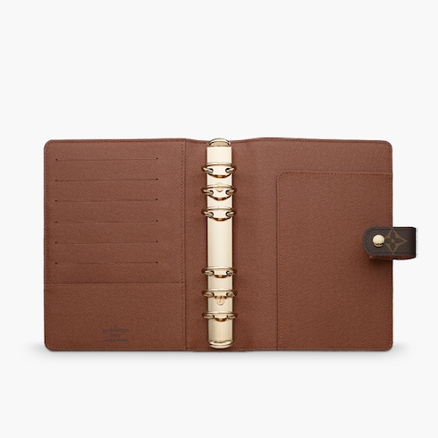 Esta funda de agenda presenta un cierre de botón a presión, seis ranuras para tarjetas de crédito y dos compartimentos.