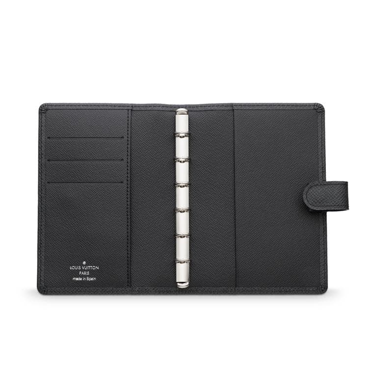 Esta agenda compacta en piel Taïga puede guardarse fácilmente en un maletín o bolso pequeño. Presenta un cierre de botón a presión y tres ranuras para tarjetas de crédito.