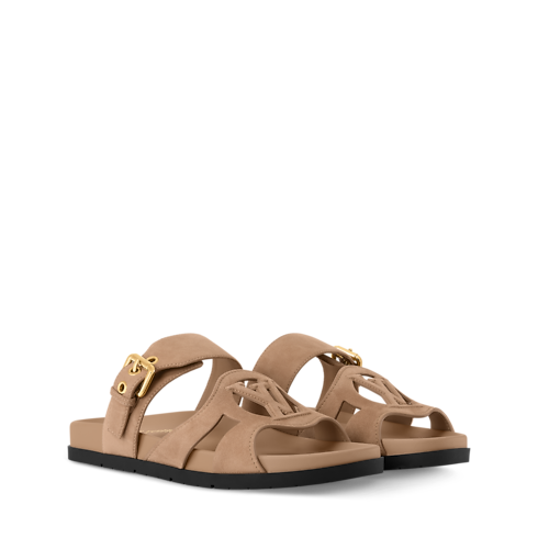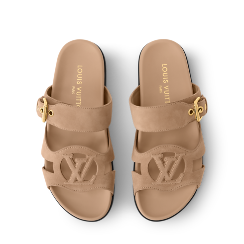 Esta sandalia LV Isola está elaborada en ante de piel caprina. El desenfadado modelo presenta una suela anatómica acolchada y retoma elementos de la línea homónima, como un LV Circle en cut-out en la tira frontal. Este diseño incorpora una correa ajustable, además de una gruesa hebilla y ojales dorados.