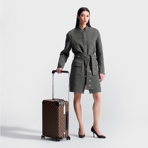 La maleta rígida Horizon 55, diseñada por Nicolas Ghesquière, luce un diseño en tonalidades marrón avellana y negra inspirado en la madera entreverada de ébano Macassar. De un tamaño ideal para llevar en cabina, este accesorio para hombre está confeccionado en lona Monogram y piel mate, e incorpora piezas metálicas de aluminio brillante. Ligera, cuenta con un interior espacioso, cuatro ruedas y un tirador exterior para llevarla fácilmente.