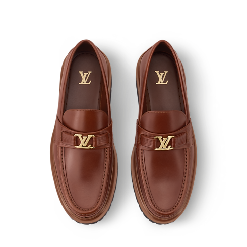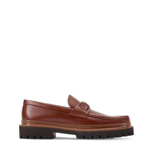 Esta versión del mocasín Major está confeccionada en piel de becerro con efecto envejecido que le aporta un elegante aspecto vintage. El modelo presenta un empeine cosido a mano con ribetes en piel Epi y un accesorio de iniciales LV en color dorado. El diseño se completa con una suela gruesa elaborada en ligera goma.