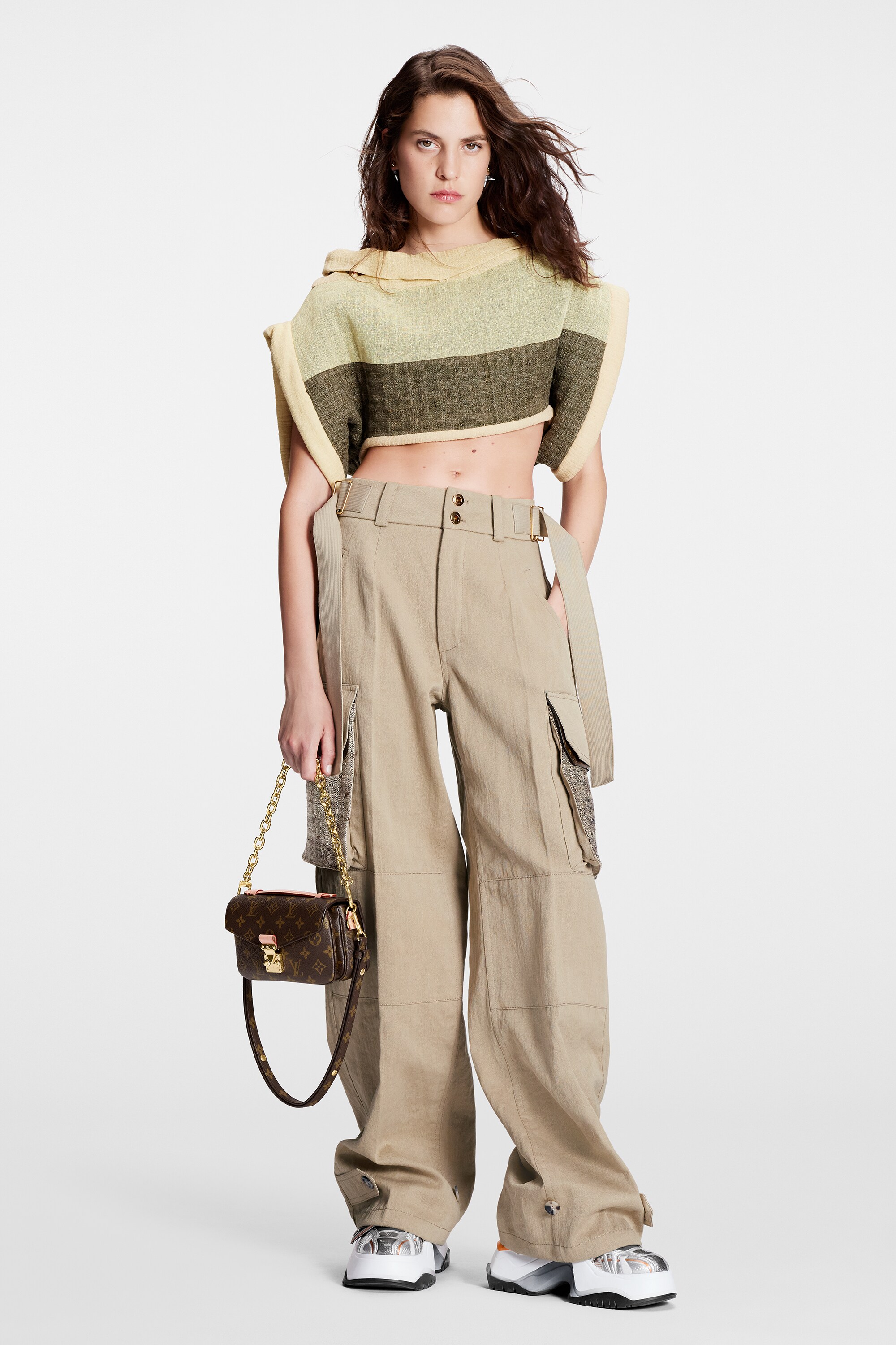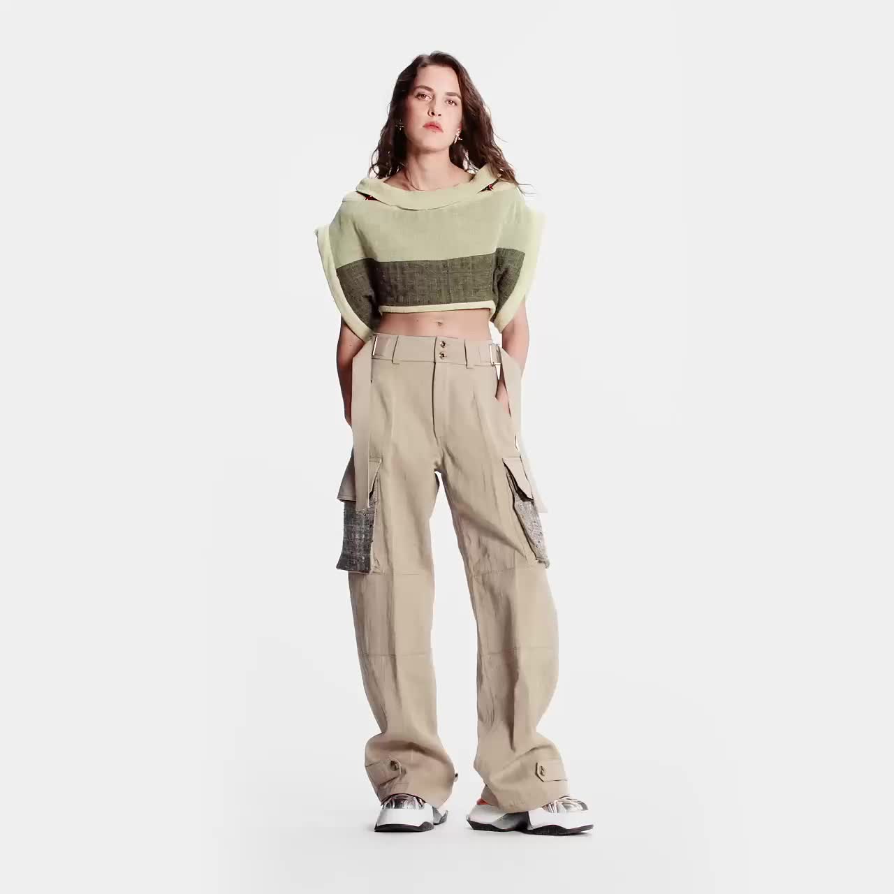 Este pantalón cargo se reinterpreta en una combinación ligera y transpirable de algodón y lino en un estilo informal y versátil. El modelo luce bolsillos utilitarios oversize a los lados con un efecto jaspeado. El diseño incorpora trabillas ajustables en la cintura y los tobillos que permiten diversas opciones de estilo y se completa con discretos detalles Monograma.