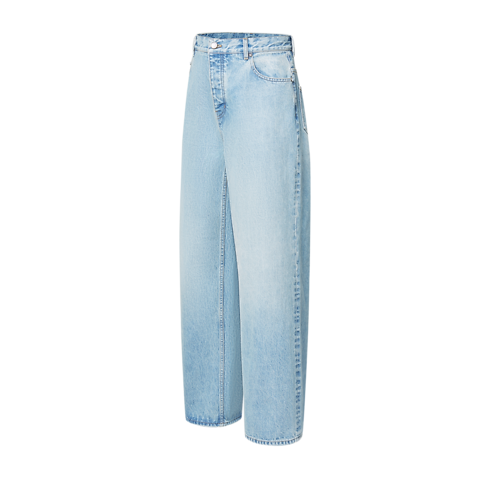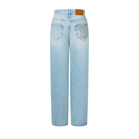 Confeccionado en exquisito tejido denim japonés, este pantalón es un diseño imprescindible que pone de manifiesto el legado magistral de Louis Vuitton. El modelo presenta un efecto lavado en color azul claro y un corte clásico de pernera ancha ideal para usarse con cualquier atuendo. La prenda luce pespuntes en tono café, un logotipo LV bordado en el bolsillo posterior y se completa con parches LV de nobuk en la cintura y en la parte frontal.