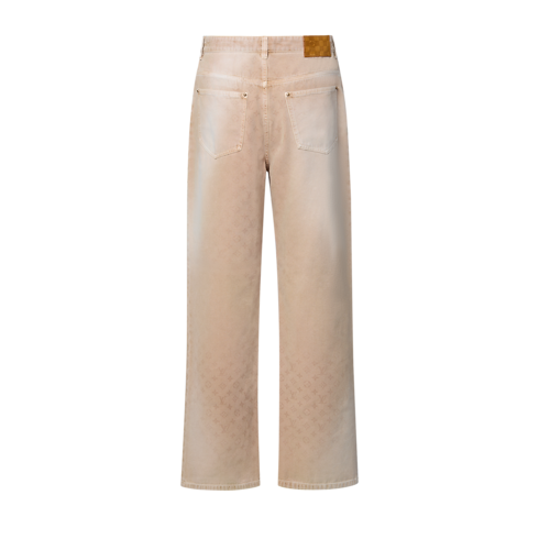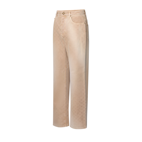 Estos pantalón skate de denim en color camel, presentados en el desfile Primavera-Verano 2026, exhiben un look suavemente desgastado inspirado en el proceso de teñido textil de la India. Incorporan un motivo Monograma deslavado impreso sobre Canvas de algodón, mientras que remaches envejecidos en tono dorado y un parche Mini Damier en nobuk aportan acentos refinados. Una chamarra a juego completa el total look.