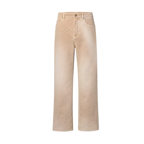 Estos pantalón skate de denim en color camel, presentados en el desfile Primavera-Verano 2026, exhiben un look suavemente desgastado inspirado en el proceso de teñido textil de la India. Incorporan un motivo Monograma deslavado impreso sobre Canvas de algodón, mientras que remaches envejecidos en tono dorado y un parche Mini Damier en nobuk aportan acentos refinados. Una chamarra a juego completa el total look.